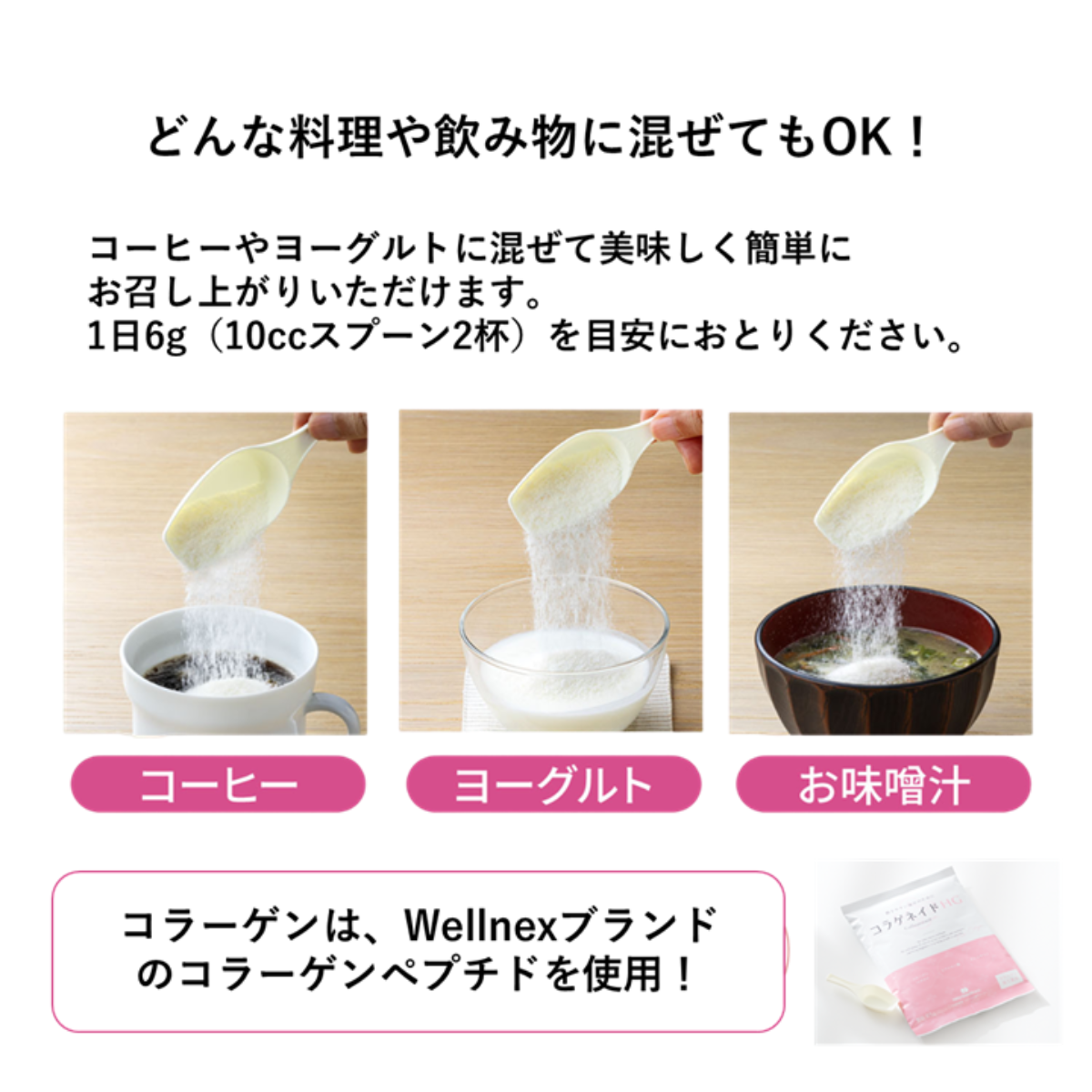 10ccのスプーンで1日2杯(約6g)を目安にお好みのお飲み物やお料理に溶かしてお召し上がりください。