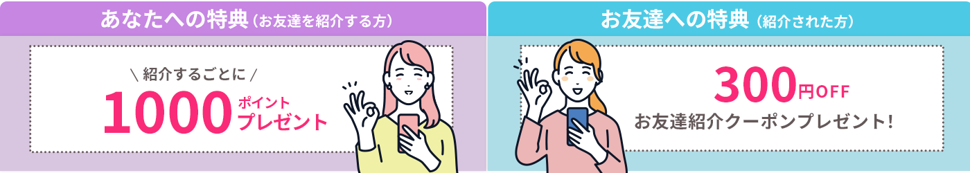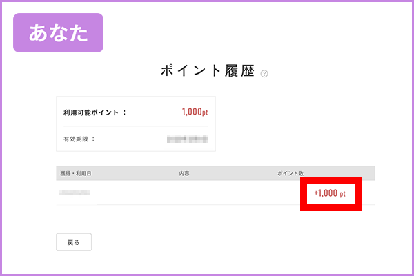 お友達がはじめての購入を完了すると、あなたに1,000ポイントが付与されます。マイページのポイント履歴からご確認いただけます。